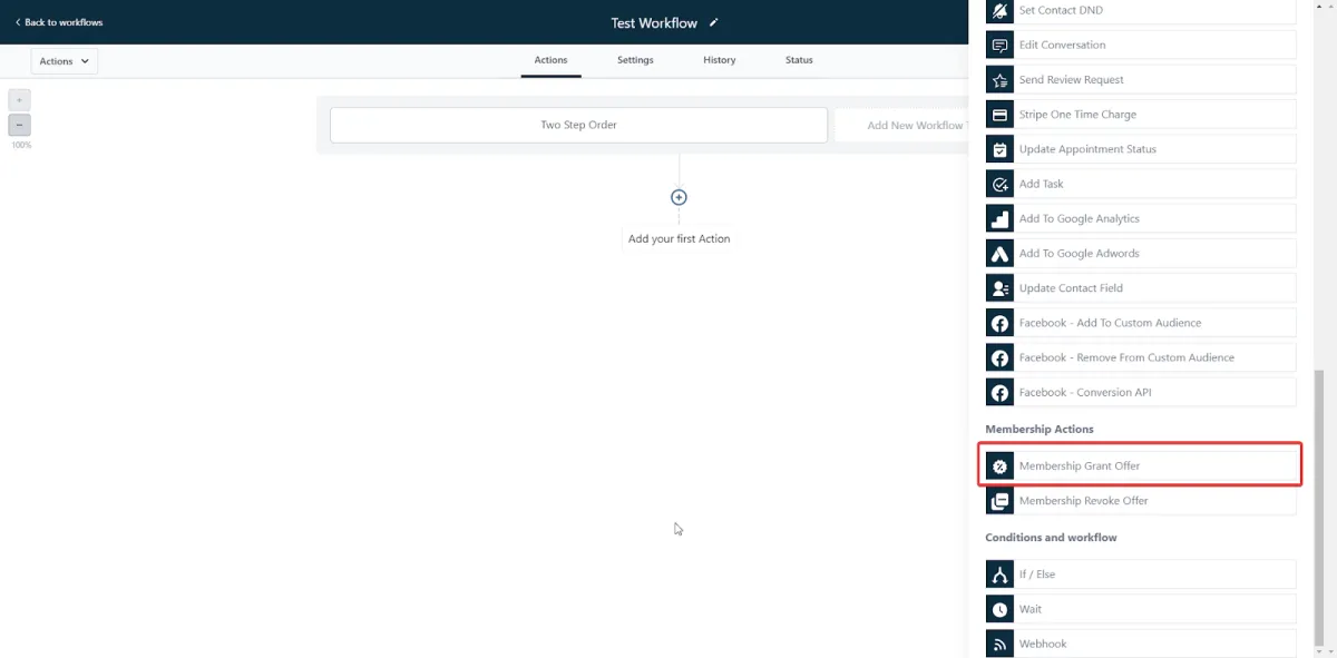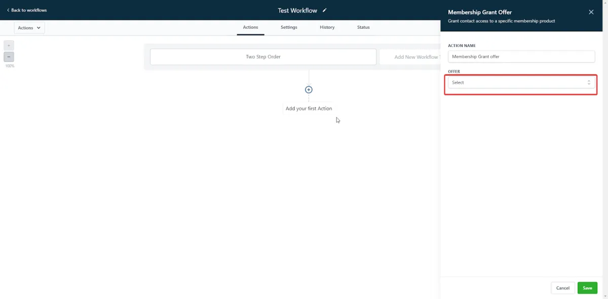 Select the action “Membership Grant offer” and choose what offer to grant.