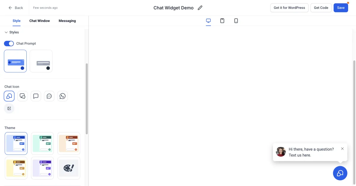 Select Chat Icon, Theme, and Widget Position – choose the bubble style, overall theme, and whether the chatbot appears on the bottom left or right of your site.