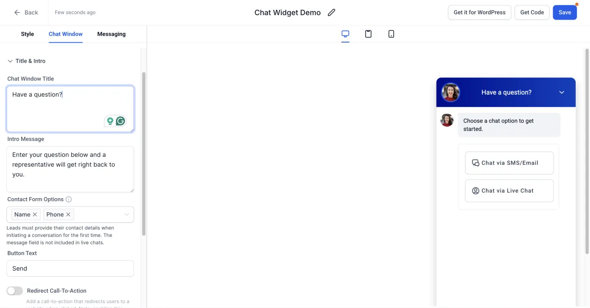 2. SMS/Email Chat – lets visitors start a chat that continues in SMS or email.