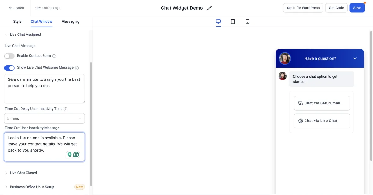 Simply click 'Save' - the top right blue button, to apply all your customizations to the chat widget.