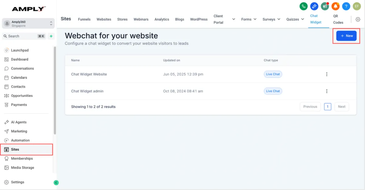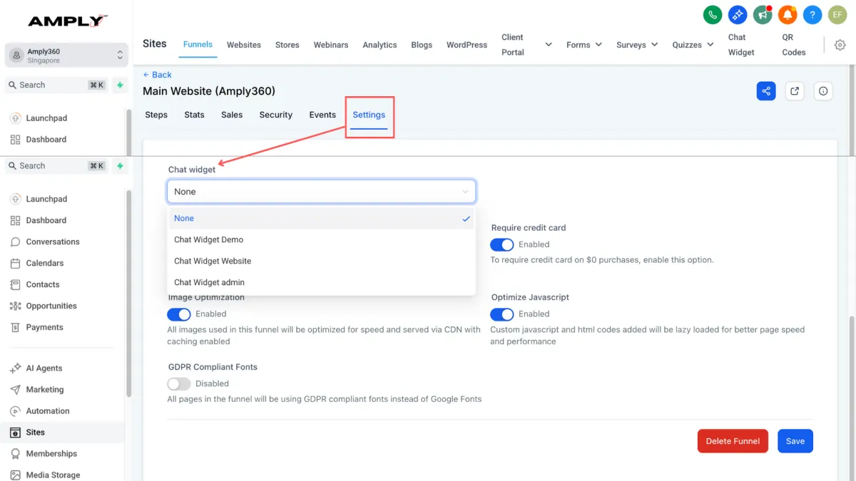 Go to the website or funnel where you want it active, open Settings > Chat Widget, and select your chatbot to enable it.