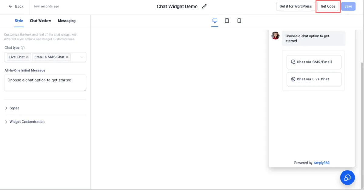 After choosing a chat type, you’ll see three main tabs on the left: Style, Chat Window, and Messaging.