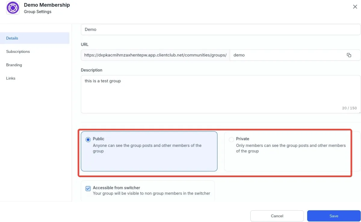 From the settings button, admins and owners can choose whether they want to set up their group as Public / Private.