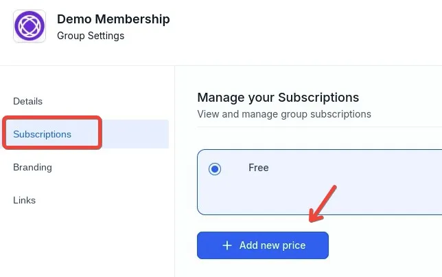 To add a price to your group, go to Settings, then Subscriptions, then, Add New Price