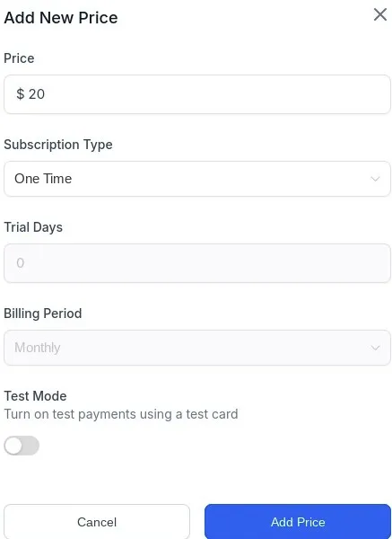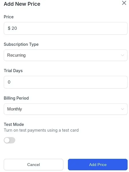 Click on "Add new price": Specify the Amount, Type as Recurring, Trial Days (if any), Billing Period as Monthly or Annually