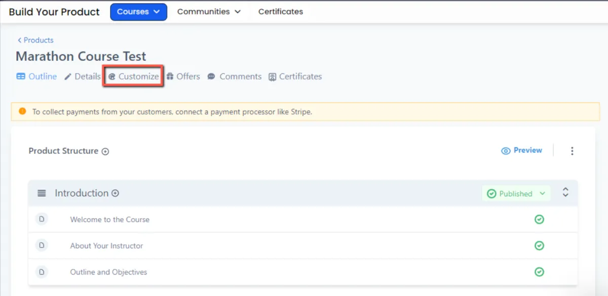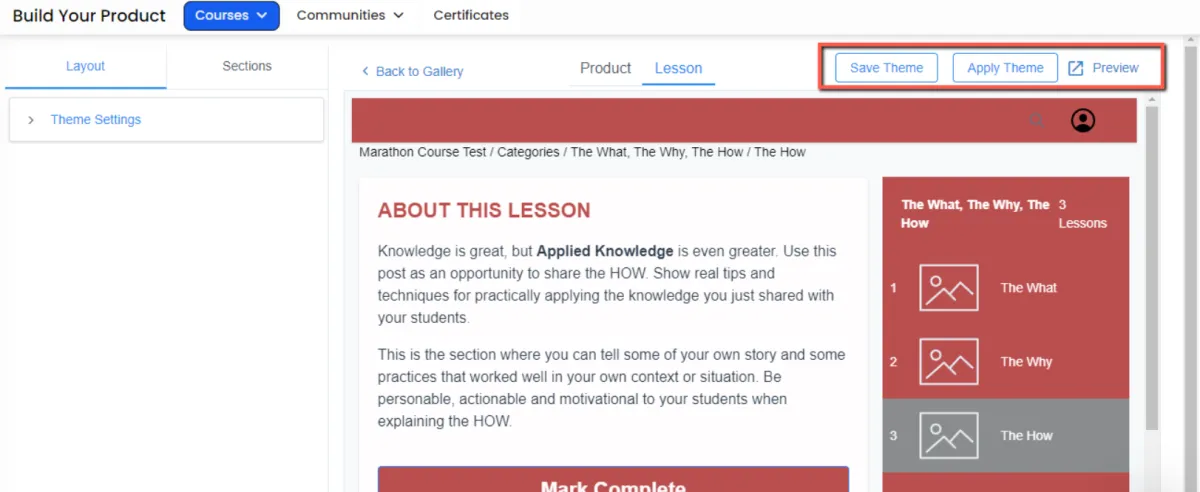 Lesson Body - change to color of your background, make font changes (font style, size & color) for your Title, Description and edit the Mark Complete button (text, font style, size, color & background). You can also edit the Next Lesson's background color, Message title (Text, font style and color) as well as make font changes (font style & color) for the Lesson title, and the Next Lesson Button.