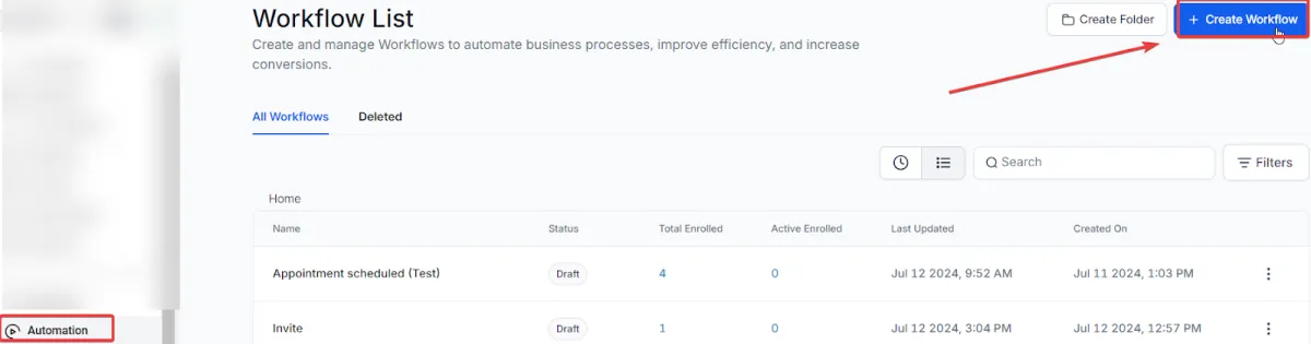 Navigate to Automation > Workflows and create a workflow.