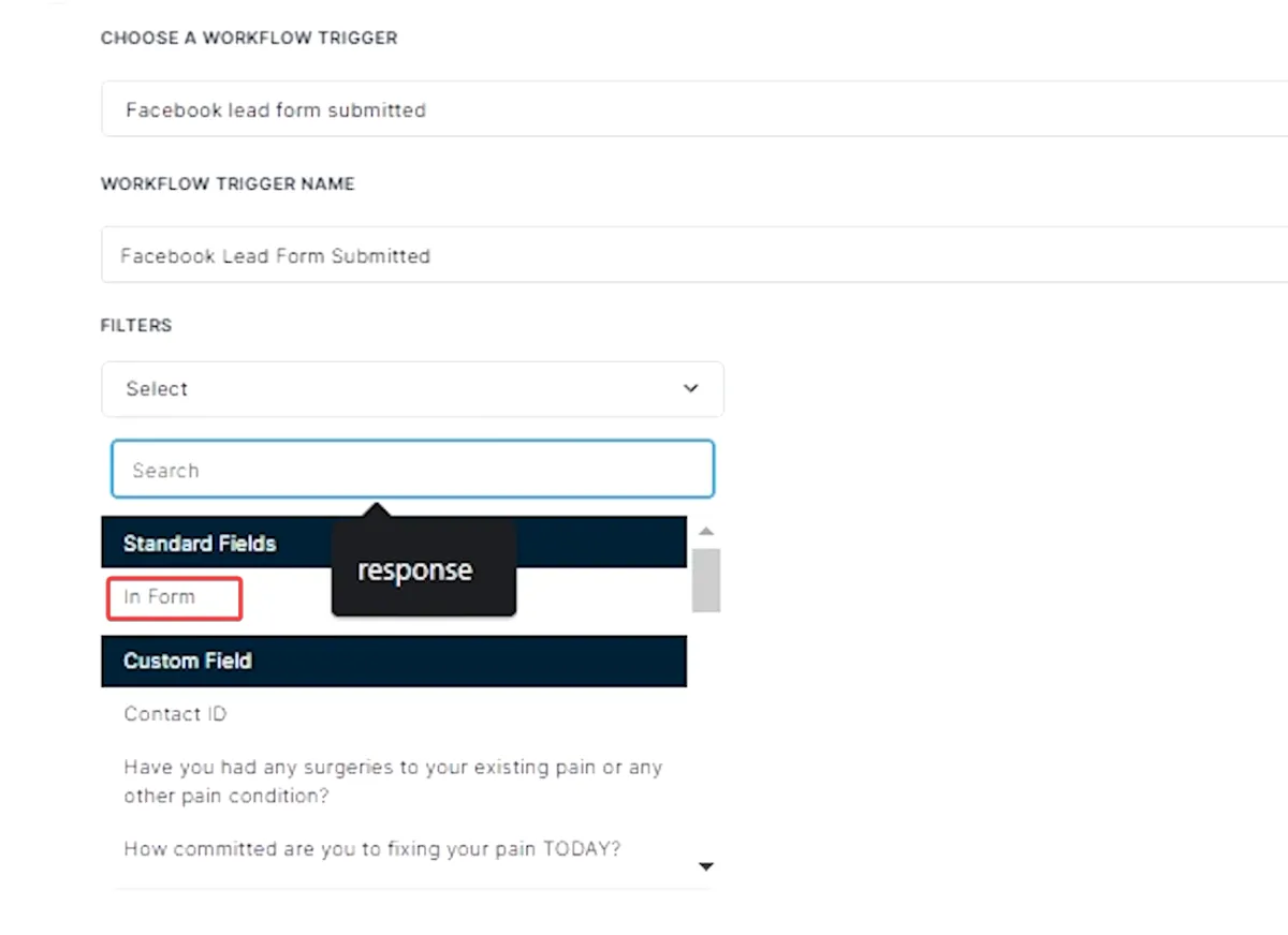 Step 3: Now that Facebook is integrated, you can set up direct form Facebook Triggers for when a lead form is submitted in Workflows.