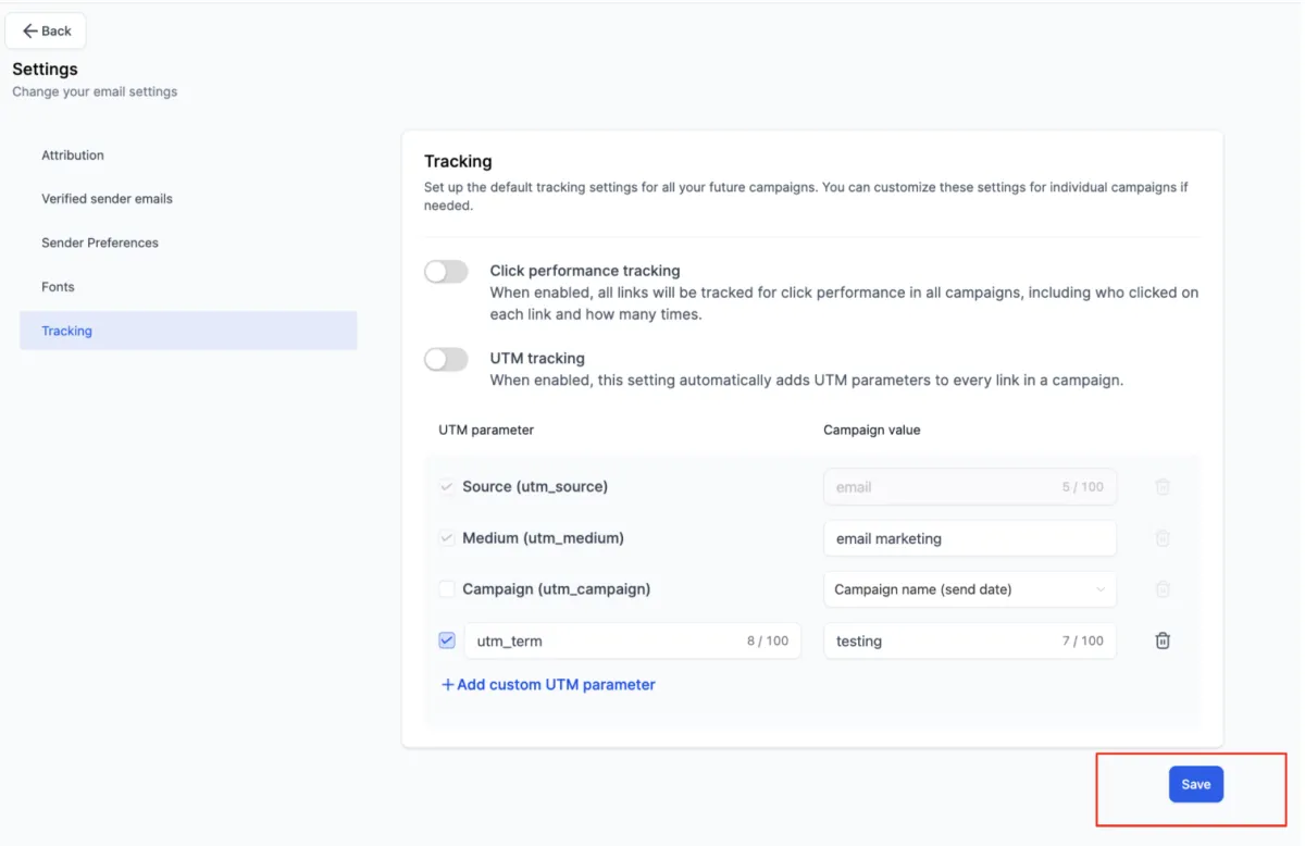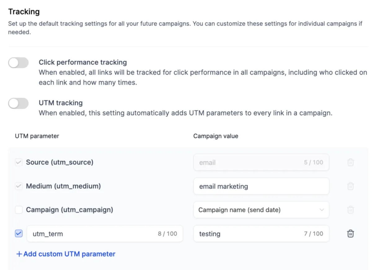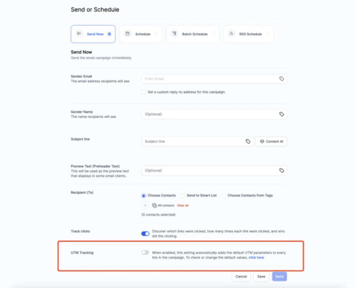 8. Disable for Specific Campaigns: To disable UTM parameters for a particular campaign, turn off the tracking option on the Send or Schedule page.