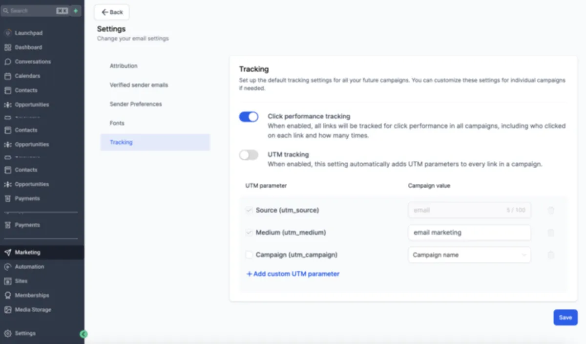 3. Review Tracking Options: Click on the Tracking option to review the default UTM parameters.